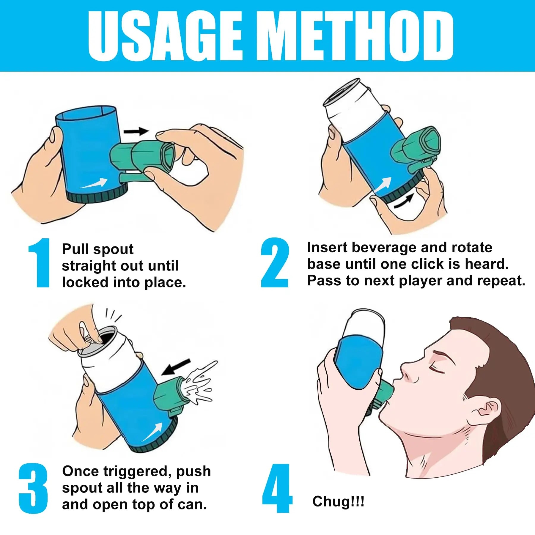 Simple and Fun Gameplay: Spin the base 3-5 rotations to Randomize, Pull to lock the spout, insert a beverage, and twist the base 1 click. Pass to the next player, and repeat – until the can erupts, making one person the “loser” who has to chug. Will it be 2, 8, or even 20 clicks?!
